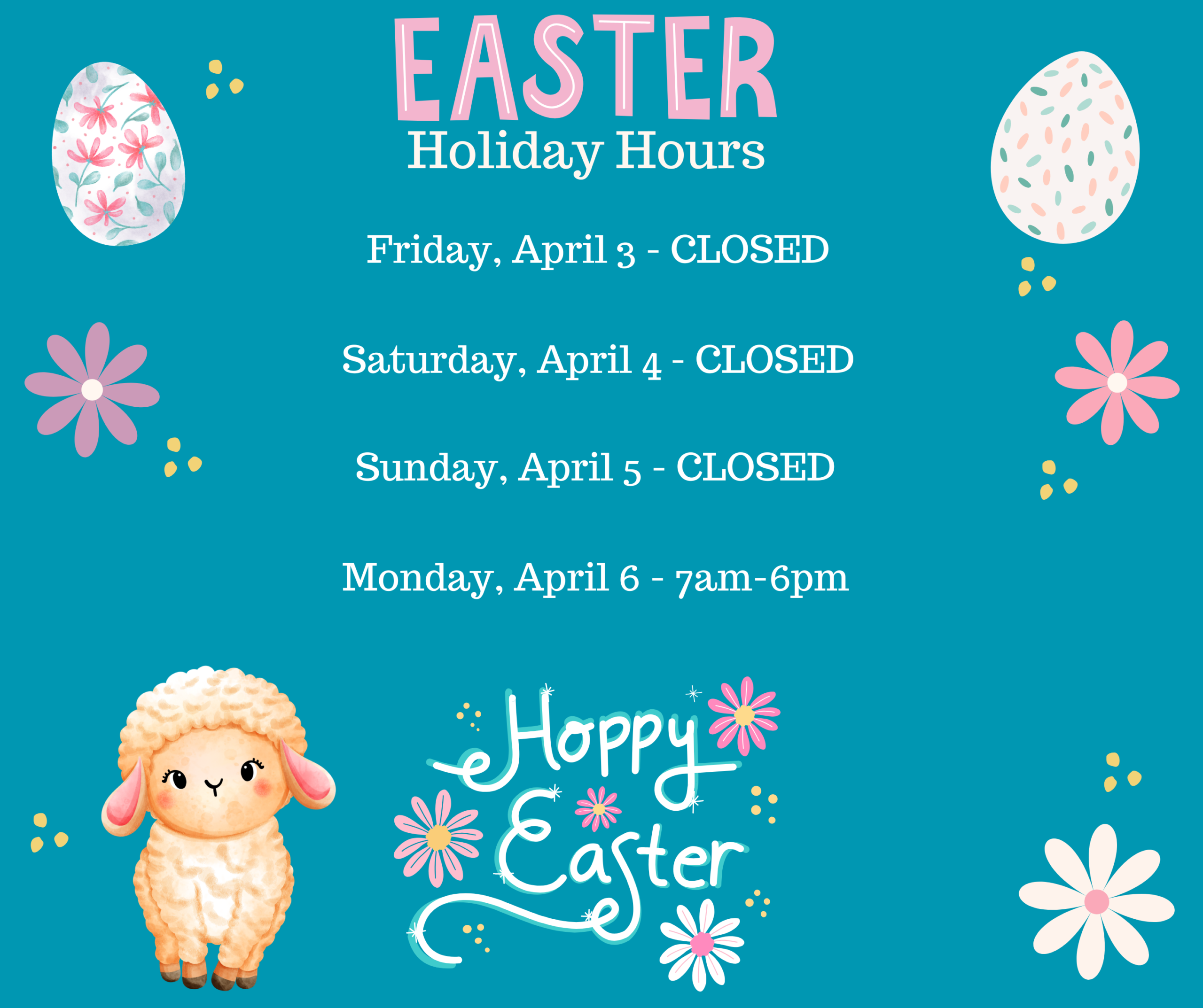 We will be closed on Good Friday, April 3, and will reopen on Monday, April 6 at 7:00am.